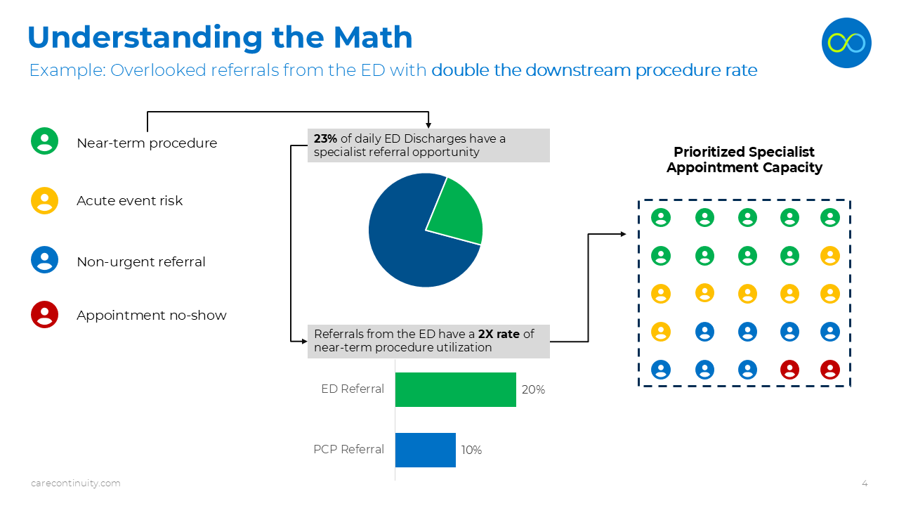 Here’s the basic math, using an example of referral opportunities among recent ED discharges. Most health systems are not actively navigating these ED patients once they leave, although many have important specialist follow-up recommendations. This is a valuable source of new referrals - in fact Care Continuity sees that about 23% of daily ED discharges actually have a specialist "recommendation" buried in the ED provider notes. In addition, these patients that entered the health system through the ED, have a significantly higher rate of requiring near-term downstream procedures. While the general population of PCP-to-specialist referrals has about a 10% rate of downstream procedure utilization, ED referrals are typically double that at20%. The math is simple - getting more of these valuable ED discharges into the specialist referral pool and prioritized for limited appointment spots, has a significant impact on specialist provider efficiency and downstream revenue opportunity. Again - using the existing appointment capacity, specialist offices can prioritize the right patients to drive downstream utilization and avoid valuable procedure leakage.